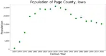 Page County is a county located in the U.S. state of Iowa. As of the 2020 census, the population was 15,211.[1] The county seat is Clarinda.[2] The county is named in honor of Captain John Page of the 4th U.S. Infantry, who was mortally wounded in the Battle of Palo Alto.
