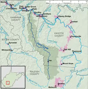 Paint Creek rises in north central Raleigh County and flows along County Route 7 north through Sweeneyburg and Maynor. At Maynor, the creek continues north along the West Virginia Turnpike.[5] The creek follows the turnpike north into Fayette County, where it runs through the communities of Willis Branch, Pax, Long Branch, and Lively before curving to the northwest. Past Mossy and East Kingston, the creek briefly turns away from the highway before following it through Westerly, Milburn, Coalfield, Mahan, and Collinsdale.[6] The creek then enters Kanawha County, where it heads north through Burnwell, Greencastle, and Whittaker. At Standard, Paint Creek Road turns away from the turnpike to follow County Route 83 (Paint Creek Road) north through Livingston and Gallagher.[7] The creek flows north through Hollygrove before reaching its mouth at the Kanawha River in Hansford.[8]