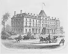 It was built from 1864 to 1866 as the first-class Buxton Hotel on the hill next to Buxton's two new railway stations. It cost £50,000 to build and had 105 rooms, a grand ballroom and 5 acres of landscaped gardens with croquet lawns and a tennis court. After its construction, the venture was liquidated and the hotel was auctioned in November 1867 at the Waterloo Hotel in Manchester. It was bought for £20,000 by a consortium including several of the original investors, the Duke of Devonshire and with the LNWR railway company as a major shareholder. It opened as the Palace Hotel in May 1868. It was the largest hotel in Buxton until the luxury Empire Hotel with 300 rooms was opened in 1903 (although the Empire never reopened after World War I and was demolished in 1964).[2][3][4]