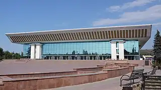 The renovation of the building was carried out in 2010-2011. The cost of it was amounted to 10.4 billion tenge.[5] The entrance to the palace has been completely changed which updated the architectural appearance of the building. The external facade of the building replaced the old cladding with new materials, new windows, stained glass windows, doors, gates, repaired exterior porches and stairways, and an increased space in walls.[6] Fire prevention measures have been provided in accordance with the new technical regulations. Another add on was the orchestra pit with three hoists and platforms for the storage of musical instruments. The building has been adapted for people with disabilities. Under the new health regulations, the kitchens were redesigned, the administrative and ancillary facilities have been changed which provided space for the backstage crew. In addition, to improve the quality of services, new premises have been provided for the building which included a meeting room for 50 people, a beauty salon, music store, recording room, flower shop, and recording studio. One of the main positive impacts of the reconstruction was the increased new land space for future use and the introduction of the parking space for cars.[7][8]