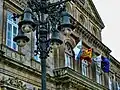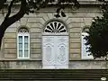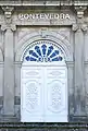 The upper floor has a large balcony with a balustrade and three further semicircular arches framed by Corinthian columns, also fluted. These columns frame the windows of the noble room.[5] Above them there are three oeils-de-boeuf and a triangular pediment on which the coat of arms of the province of Pontevedra is displayed. The windows in the corners of the building are topped by semicircular Pediments. They are decorated with Lintels with Scallops.
