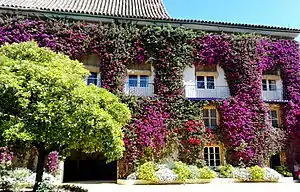 The entry door is of Mudéjar style.[7] The palace was fitted with eleven patios, nine fountains, and over 100 marble columns. Of these, one patio remains, and it is surrounded by a gallery with columns.[1] The Andalusian patio, like a similar one at Casa de Pilatos, dominates the exterior of the property. At the entrance to the palace, in the main archway, there is the shield of the Duchy of Alba in tiles, made by Triana of Seville in the 17th or 18th century. The gardens hold very important and unique species of plants (for example one of the oldest cycas revoluta in the world). Its fabulous bougainvillea facade is very spectacular and an icon of the Palace.