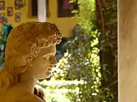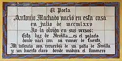 The courtyard garden, divided into four parts in keeping with its traditional Islamic style, includes tiled paths and a centralized raised fountain.[8] The palace garden's lemon trees and fountain are recurring symbols in Machado's poetry.[9] Behind the garden is a courtyard surrounded by arches with columns of white marble. The arch situated west of the courtyard in the lower galleries gives access to the building that was used as chapel. The 15th-century chapel has fared badly during restorations.[1] The altar contains several tiles with metallic reflections, typical of 16th-century Seville ceramics.