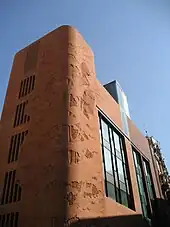 The rich decoration of the façade of the palace, which incorporates elements from many sources, including traditional Spanish and Arabic architecture, is successfully married with the building's structure. The exposed red brick and iron, the mosaics, the stained glass, and the glazed tiles were chosen and situated to give a feeling of openness and transparency. Even Miguel Blay's massive sculptural group symbolizing Catalan music on the corner of the building does not impede the view into or out from the interior (see photograph). As Carandell and co-authors (2006, 20) have pointed out, in the palace "the house as a defense and protected inner space has ceased to exist".