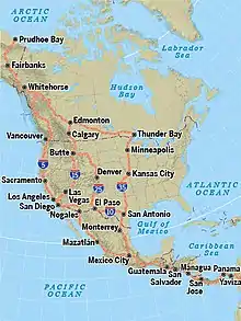 The Pan-American Highway route in North America is the portion of a network of roads nearly 48,000 kilometres (30,000 mi) in length that travels through the mainland nations of the Americas. No definitive length of the Pan American Highway exists because the Canadian government has never officially defined any specific route as being part of the Pan-American Highway, while in the United States, the Federal Highway Administration (FHWA) has designated the entire Interstate Highway System part of the Pan-American Highway System, although this has not yet been reinforced by any official highway signage.[1][2] Mexico officially has many branches connecting to various interstate highways at the U.S. border.