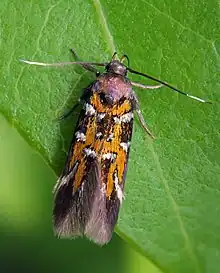 Pancalia leuwenhoekella has a wingspan of 10–12 mm. The head and thorax are dark bronzy-metallic. Antennae usually with white subapical band. Forewings are deep orange, margins more or less blackish; a narrow interrupted fascia at 1/4, a costal spot before middle and another inwardly oblique at 3/4, a dorsal median spot and an erect tornal mark pale golden-metallic, blackish-edged ; a whitish spot in cilia on posterior costal spot. Hindwings are rather dark bronzy-fuscous.[4] This species is very similar to Pancalia schwarzella . [3]