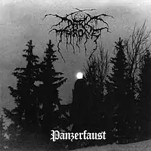 Panzerfaust is the fifth studio album by Norwegian black metal band Darkthrone, released in June 1995 by Moonfog Productions (Europe) and The End Records (North America).[2] The track "Quintessence" featured lyrics by Varg Vikernes, their second and final album to do so. As with the previous album Transilvanian Hunger, all instruments on Panzerfaust were recorded solely by Fenriz on a 4-track recorder set up in his bedroom (dubbed "Necrohell Studios" by the band); with Nocturno Culto performing vocals on all songs except for the outro.