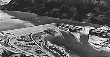 The complex arrangement placed a 250-foot (76 m) earth embankment across the main channel of the river, diverting the flow to the west, where a straight intake dam structure extending parallel to the riverbed on the riverbank would receive water for the powerplant. A separate curved spillway dam would be located downstream from the intake dam. At the end of the diverted channel an embankment saddle dam would seal the channel. The powerplant was planned to have an initial capacity of 576 MW with eight 72MW units, expandable to 1000 MW with six more generators in the future.[3]