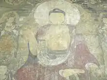 This painting features the Bhaisajyaguru Buddha and two Bodhisattvas, Avalokitesvara and Cintamanicakra[2] in the centre. Traditionally Bhaisajyaguru Buddha (Yaoshi fo) is considered as the Buddha of medicine (both physically and spiritually) in Mahayana Buddhism.[2]