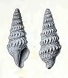 The small fusiform shell contains 11 whorls (the superior ones are eroded), covered with a gray epidermis. The lines of growth are rather strong and very flexuous, and on passing the delicate spiral lirae, except in the concavity above the angle of the whorls and at the base of the body whorl, are delicately nodulous. The last volution below the nodose periphery has about fifteen lirae, of which about six of the upper ones are nodulous, the rest, around the anterior contracted portion, being simple and thread-like. The tubercles on the angle are about eighteen in number, and the lirae above it three or four. The aperture is small. The outer lip is thin. The columella is almost upright and shows a small callus. The siphonal canal is short.[2]