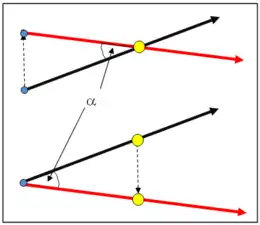 Parallax is a displacement or difference in the apparent position of an object viewed along two different lines of sight and is measured by the angle or half-angle of inclination between those two lines.[1][2] Due to foreshortening, nearby objects show a larger parallax than farther objects, so parallax can be used to determine distances.