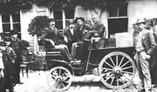 Jules-Albert de Dion finished first in a steam powered De Dion tractor towing a caléche carriage, but was not eligible for the prize. Among the passengers are de Dion, Étienne van Zuylen van Nyevelt-Rothschild, and writer Émile Driant.