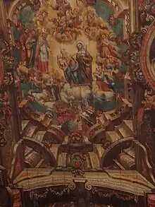 The painting of the ceiling of the vaulted nave is of oil on wood. The painting is 2,600 centimetres (1,000 in) long, 1,200 centimetres (470 in) wide, and has a height of 250 centimetres (98 in). The center of the painting has a large image of the Holy Family in a stylized medallion.[5]