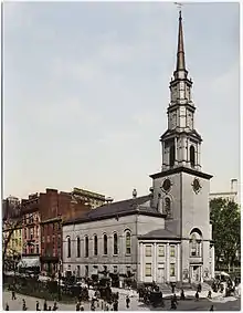 The church is next to the historic Granary Burying Ground and was site of granary building for which the burial grounds was named. The first worship service was held on January 10, 1810. The church became known as "Brimstone Corner", in part because of the fervent missionary character of its preaching,[5] and in part because of the storage of gunpowder during the War of 1812.[6]