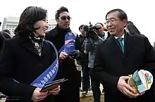 In the Seoul mayoral by-election on October 26, 2011, he was elected as an independent candidate with the support of the Democratic Party and Democratic Labor Party.[15] Park's victory is seen as a blow in particular to the Grand National Party and the prospective presidential candidacy of Park Geun-hye, who had publicly supported Park Won-soon's opponent Na Kyung-won, and a triumph for the independent Ahn Cheol-Soo, whose support he received.[15] However, the inability of the Democratic Party to present its own candidate, and Park's refusal to join it after he had received its endorsement, served to present Park as a candidate independent of the interests of both established parties.[15][16]