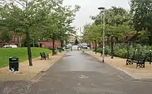 The furniture of this park in Govanhill includes benches, litter bins and railings.