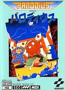 Parodius: The Octopus Saves the Earth[lower-alpha 1], also known as Parodius, is a scrolling shooter video game developed by Konami for the MSX computer and was released in Japan. The game is notable for being the first title in the Parodius series, although it is often confused with its sequel Parodius! From Myth to Laughter. The name itself is a portmanteau of "Gradius" and "Parody" and, eponymously, the game is a parody of the Gradius series of space-based horizontally scrolling shooters. Many of the characters and enemies are derived from that famous shooter series, while other elements are extracted from other Konami titles, such as Antarctic Adventure and TwinBee. This game is of particular note in the series as being heavily infused with Japanese culture and folklore.