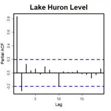 Partial autocorrelation is a commonly used tool for identifying the order of an autoregressive model.[6] As previously mentioned, the partial autocorrelation of an AR(p) process is zero at lags greater than p.[5][8] If an AR model is determined to be appropriate, then the sample partial autocorrelation plot is examined to help identify the order.