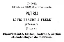 On October 10, 1892 Louis Brand & Fils, run by Louis Paul and César Brandt registered the name 'Patria' with the description, "Mouvements, boites, cadrans, ecrins et emballages de montres". Translated to English, this means "Movements, cases, dials, watch boxes and watch packaging.[1] The name 'Patria' is from the latin word for "Fatherland" or "Homeland", cognate with Ancient Greek πατριά (patriá, “generation, ancestry, descent, tribe, family”) and πατρίς (patrís, “place of one's ancestors”).[5]