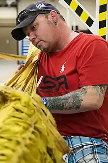 ![]() Patrick McDonald helps repack a B-52H Stratofortress drag chute during a tour of Barksdale Air Force Base in 2014 | |