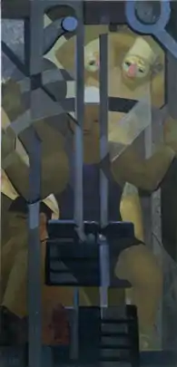 Patrick Webb (born 1955) is an American artist who has portrayed contemporary queer experience through representational narrative paintings.[1][2][3] He is best known for his "Punchinello" paintings, begun in the early 1990s, which feature a gay "everyman" based on the Italian commedia dell'arte stock character, Pulcinella.[4][5][6] Art historians Jonathan D. Katz and Jonathan Weinberg place Webb among artists who that gave voice to the loss and grief associated with the AIDS epidemic by looking beyond the message-heavy activist art and anti-expressive postmodernism of the 1980s to reinvigorated art-historical narrative traditions.[1][2][7] Writers note his work for its classically influenced technique and pathos in fleshing out fears, fantasies, experiences and social dichotomies between self and Other, individual and collective, personal and sociocultural.[8][9][10] He draws on pictorial strategies from old masters as well as modern artists such as Balthus, Jacob Lawrence, Philip Guston and the magic realist Jared French, building scenarios out of architecturally structured compositions, carefully placed elements and precise gestures.[11][12][13]