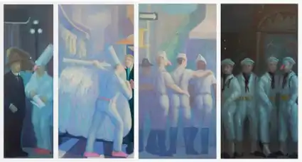 Webb's early work depicted figures with a playful eroticism in city scenes and landscapes informed by artists such as Edwin Dickinson.[21][22] According to Nancy Grimes, in that work he sought a visual language to express gay experience "in an unembarrassed, straightforward manner, free from cliché and sentimentality."[21][9] By the late 1980s, with the increasing threat and tragedy of the AIDS epidemic, Webb turned to desperate and angry, monumental images of street battles, fires and parades, with queer identity emerging as a more pronounced theme.[23][21] He often reworked classical paintings in these canvasses, undermining mainstream cultural and sexual norms, as in the six-by-eighteen-foot triptych, Halloween Parade (1989), an allegory of death inspired by the annual Greenwich Village parade, which restaged Mantegna's Triumph of Caesar in queer terms.[21]