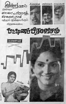 Pattina Pravesam (transl.Entering a City)[3] is a 1977 Indian Tamil-language drama film written and directed by K. Balachander. It is based on the play of the same name, written by Visu and staged the same year. The film stars Delhi Ganesh, Sivachandran and Sarath Babu, all making their cinematic acting debuts. It was released on 9 September 1977. The plot is similar to the 1965 film The Conquerors of the Golden City, directed by Getin Gurtop and the 1964 film Birds of Exile (Gurbet Kuslari in Turkish) by Halit Refig.[4]
