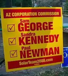 Newman and Kennedy ran as clean candidates under Arizona's Clean Elections system while George ran a traditional campaign. Under Arizona's Clean Elections system, the state is required to match funds raised by traditionally funded candidates up to a certain amount. The three were dubbed The Solar Team. George contributed nearly half a million dollars of his own money and pooled this money with Newman's and Kennedy's Clean Election funds. With this strategy, the Solar Team was able to run numerous television ads and post signs all over the state of Arizona. This brought more attention than normally paid to the Corporation Commission race. Although George donated much of his own money, only Newman and Kennedy won in the General Election.[5]
