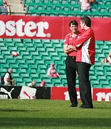 Returning to Australia and the Sydney Swans, Roos then became an assistant coach under senior coach Rodney Eade in 2001.[14] Part-way through the 2002 season, with the Swans' record becoming worse by the week, Eade resigned. The club administration started the search for a new coach and it is widely believed that negotiations with Terry Wallace were at an advanced stage. Nevertheless, when Eade finally went with several games of the minor round still to be played, Roos was appointed caretaker senior coach for the remainder of the 2002 season, a move hugely popular with Swans fans, who remembered his great contribution to the club as a player.[15][16][17]