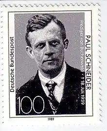 Paul Robert Schneider (August 29, 1897 – July 18, 1939) was a German pastor of the Evangelical Church of the old-Prussian Union who was the first Protestant minister to be martyred by the Nazis.[1][2] He was murdered with a strophanthin injection at the concentration camp of Buchenwald.[3]