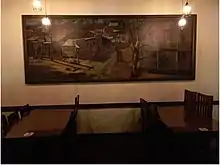 The cyclorama, under the genius of this man, came out a masterpiece. The only concession Paul asked, to which Walter Knott readily agreed, was the exclusive right to manufacture and sell art souvenirs, booklets and paintings on the premise.[12] Von Klieben lived on the farm and had his studio "at the end of the Ghost Town Trail," in "the adobe building which adjoins Ghost Town" that was completed shortly before February 1942 and was constructed of adobe bricks made on the property. This building is likely that which is now used as the entrance to Spurs restaurant.[13][14]