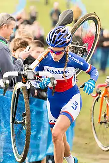 Pauline Ferrand-Prévot (born 10 February 1992) is a French multi-discipline bicycle racer, who rides for UCI Mountain Bike team Ineos Grenadiers in cross-country cycling.[5] Ferrand-Prévot has also competed in road bicycle racing and cyclo-cross during her career,[6] winning the world title in each discipline. During the 2015 season, aged just 23, she became the first person ever – in the history of cycling – to simultaneously hold the World road title, World cyclo-cross title and World cross-country mountain bike title.[7]
