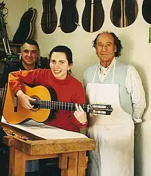 The Austrian classical guitarist Johanna Beisteiner (middle) in the workshop of Spanish luthiers Paulino Bernabe Senior (right) and Junior (left). Madrid (Spain), October 2000