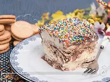 Pavê (Portuguese pronunciation: [pa've]) is a Brazilian dessert that consists of alternating layers of biscuits (ladyfingers or corn starch biscuits) and a cream made using condensed milk. It is similar in structure to the tiramisu.[1]