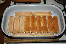 Ladyfinger biscuits arranged in a container in a similar fashion to a cobblestone pavement