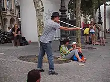 Peashooting (sometimes spelled pea-shooting or pea shooting) is the act of shooting dried peas out of a tube, a peashooter, by blowing through it. A similar effect can be achieved by using small bits of paper instead of peas. A sport has developed around pea shooting, in which peas are shot into a target, similar to those used for archery. The target may be made of a soft substance (putty) so that the peas will stick into it or at least make indentations that easily identify the location of the hit. The World Pea Shooting Championships are held annually in the village of Witcham, UK.[2]