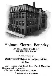 1916 ad showing Holmes Electrotype Foundry in Worcester, Massachusetts.