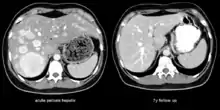 | The CT scan of a patient with peliosis hepatis (left): The follow-up CT (right) after 7 years shows full remission. | |