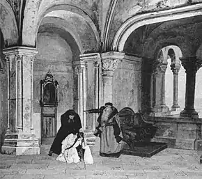 At this point, Debussy too was a devotee of Wagner's music, but—eager to please his father—he was probably more swayed by Mendès' promise of a performance at the Paris Opéra and the money and reputation this would bring. Mendès' libretto, with its conventional plot, offered rather less encouragement to his creative abilities.[4] In the words of critic Victor Lederer, "Desperate to sink his teeth into a project of substance, the young composer accepted the type of old-fashioned libretto he dreaded, filled with howlers and lusty choruses of soldiers calling for wine."[5] Debussy's letters and conversations with friends reveal his increasing frustration with the Mendès libretto and the composer's enthusiasm for the Wagnerian aesthetic was also waning. In a letter of January 1892, he wrote, "My life is hardship and misery thanks to this opera. Everything about it is wrong for me." And to Paul Dukas, he confessed that Rodrigue was "totally at odds with all that I dream about, demanding a type of music that is alien to me."[6]