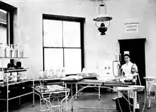 The operating room, circa 1900. Above the door can be seen a marble slab with the words "Pemberton Memorial" carved into it, which was required per the agreement for funding.