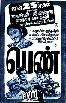 Penn (transl.Girl) is a 1954 Indian Tamil-language romantic comedy film written by Ra. Venkatachalam and directed by M. V. Raman. It stars Vyjayanthimala, Gemini Ganesan, S. Balachander and Anjali Devi while V. Nagayya, V. K. Ramasamy, K. N. Kamlam, K. R. Chellam and K. Sankarapani as the ensemble cast, was produce by A. V. Chettiar of AVM Productions. The score is composed by R. Sudharsanam with the lyrics by Papanasam Sivan and Udumalai Narayana Kavi, Ku. Sa. Krishnamurthy, K. P. Kamakshi and V. Seetharaman. Editing was done by K. Shankar and M. V. Raman while the camera was handled by T. Muthu Sami.