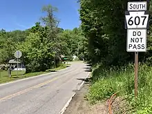 PA 607 begins at an intersection with PA 872 in the borough of Austin in Potter County, heading west on two-lane undivided Main Street. The road passes a mix of homes and businesses before it turns to the northwest and runs between wooded areas to the north and residential areas to the south. The route heads into forested areas of hills and leaves Austin for Portage Township, where it becomes an unnamed road. PA 607 enters Keating Township and continues northwest through rural land, passing through tracts of Susquehannock State Forest. Farther northwest, the road makes a curve to the west before a sharp turn to the south. PA 607 reaches its northern terminus at an intersection with PA 155 in the community of Keating Summit.[2][3]