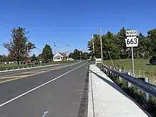 PA 663 was once part of the Steinsburg and Milford Square Turnpike. The turnpike was chartered in March 1858.[6] When Pennsylvania legislated routes in 1911, what is now PA 663 was not given a number.[7] PA 663 was designated in 1930 to run from in U.S. Route 422 (US 422, High Street) in Pottstown north to PA 73 in New Hanover Township. At this time, the entire length of the route was paved, along with the unnumbered road between PA 73 and Quakertown.[2] In 1936, PA 663 was extended north to an intersection with US 309 (now PA 309) and PA 212 (now PA 313) in Quakertown. The route followed its current alignment between PA 73 and Pennsburg before it followed Quakertown Road and Sleepy Hollow Road to Spinnerstown, where it turned east and followed Spinnerstown Road and Milford Square Pike to Quakertown.[8] By 1967, the southern terminus of PA 663 was rerouted to PA 100 in Pottstown, heading west on King Street.[9] In the 1960s, PA 663 was shifted from Milford Square Pike to a new alignment to the north between the Pennsylvania Turnpike Northeast Extension and Quakertown.[10] After construction began in 1973, a new alignment of PA 663 to the south from Pennsburg to the Pennsylvania Turnpike Northeast Extension opened a year later, with the route moved off Quakertown Road, Sleepy Hollow Road, and Spinnerstown Road.[11][12]