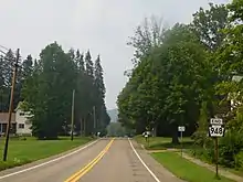 PA 948 begins at an intersection with PA 255 in Fox Township, Elk County, heading southwest on two-lane undivided Fairview Road. The road passes through rural residential areas, curving west into a mix of farmland, woodland, and homes. The route becomes Main Street and runs through the community of Kersey, where it passes residences and a few businesses. PA 948 becomes West Main Street Extended and heads west-northwest into wooded areas with some fields and development, becoming Shelvey Summit Road and passing through Shelvey. The road heads west between agricultural areas to the north and woodland to the south before heading into more wooded areas with some homes, curving northwest. The route heads into Ridgway Township and becomes Kersey Road, heading between woods to the northeast and farmland to the southwest with some development. PA 948 comes to an intersection with U.S. Route 219 (US 219) in Boot Jack and continues north-northwest concurrent with that route on Boot Jack Road.[2][3]
