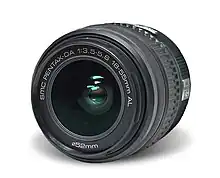 The SMC Pentax-DA 18-55mm f/3.5-5.6 AL lens is a standard zoom lens for the Pentax K-mount. It is often sold as a kit lens with Pentax digital SLR cameras and has a 35mm equivalent focal length of 27–82.5mm. Its optical formula is made of 12 elements in 9 groups. There are two variants of this lens: