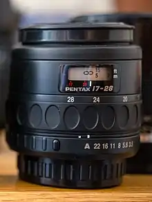 The smc Pentax-F 17–28mm Fish-eye f/3.5–4.5 is the first fisheye zoom lens, manufactured by Pentax for single-lens reflex cameras (SLRs) with a K lens mount. At its widest setting of 17mm, it affords a 180° diagonal angle of view images for all K-mount full-frame SLR cameras; at 28mm, the diagonal angle of view is reduced to 90° on the diagonal. Typical fisheye barrel distortion is evident at all focal lengths. A successor model, the Pentax DA 10-17mm lens, was introduced with the same view angles and closer focusing capability for APS-C cameras in 2006.