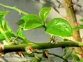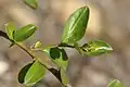 The four species of Pereskia as the genus is now circumscribed share many features in common with Leuenbergeria and Rhodocactus, which were formerly included in a broadly defined Pereskia. They are shrubs, trees or climbing vines, with maximum heights varying between 3 and 10 m. Unlike the great majority of species of cacti, they have persistent leaves. Like all cacti, they have spines borne on areoles. Their succulent leaves are longer than wide, reaching 11 cm by 5 cm in the case of P. aculeata. Their flowers are borne in small clusters or are solitary, except for P. aculeata which can have inflorescences of 70 or more individual flowers. P. aculeata has edible fruits, 1.5–2.5 cm in diameter; the other species have smaller fruits, only up to 6 mm in diameter in the case of P. horrida. Unlike Leuenbergeria, the stems of Pereskia delay forming bark and have stomata. Unlike Rhodocactus, there are no leaves on the areoles.[1][2][3]