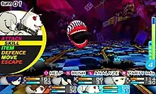 When an enemy is encountered, the player battles against them using their Personas, which can attack enemies and heal allies. In addition to their main Personas, characters can also be equipped with sub-personas.[9] By using skills that the enemies are weak against or scoring a critical hit, the characters enter a status known as "boost", which eliminates health and magic costs temporarily. Boosting multiple characters increases the likelihood of performing more powerful attacks, or attacks combining multiple characters.[10]