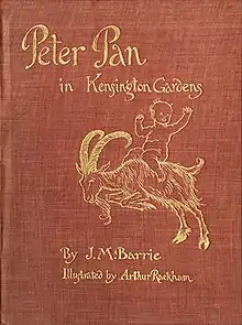 Peter Pan in Kensington Gardens is a novel by J. M. Barrie, illustrated by Arthur Rackham, and published by Hodder & Stoughton in late November or early December 1906; it is one of four major literary works by Barrie featuring the widely known literary character he created, Peter Pan. Most of the text originally appeared as chapters 13–18 of Barrie's 1902 novel The Little White Bird.