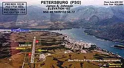 Petersburg James A. Johnson Airport (IATA: PSG, ICAO: PAPG, FAA LID: PSG) is a state owned, public use airport located one nautical mile (2 km) southeast of the central business district of Petersburg, a city in the Petersburg Borough of the U.S. state of Alaska that has no road access to the outside world.[1] Airline service is subsidized by the Essential Air Service program.